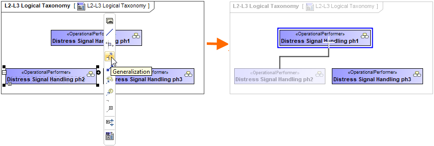 2. From the smart manipulator, which appears after you select the element, choose Generalization.