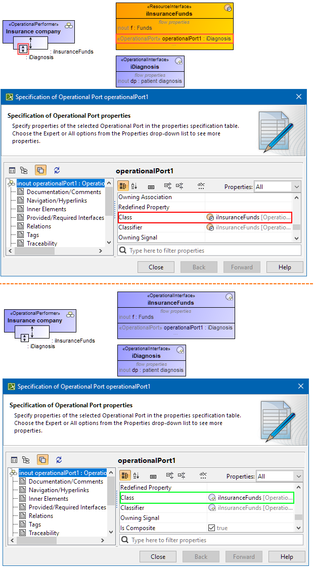 The type is incorrect for the Operational Port class property. The Class property value should be Operational Agent, Operational Interface, or one of these specializations.